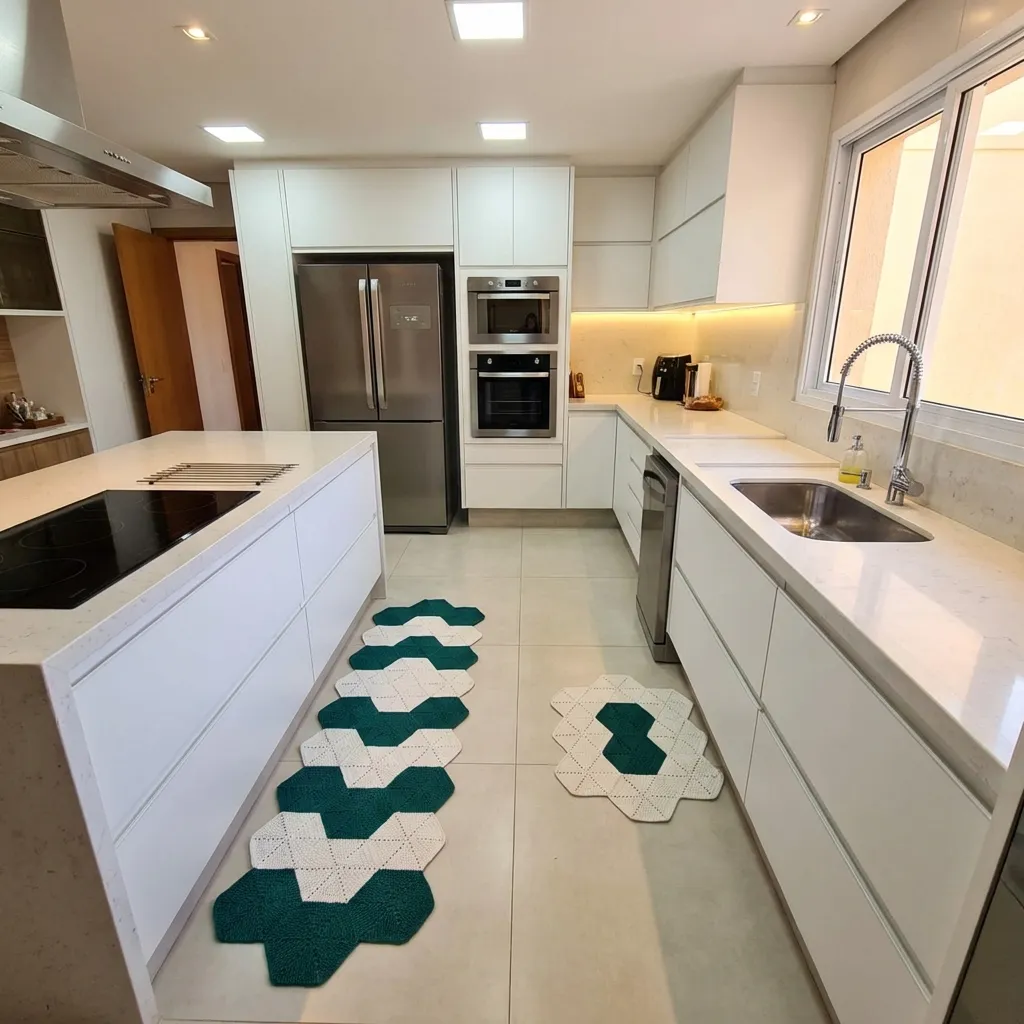 Tapete Hexagonal Artesanal – Conjunto com 2 Peças Tapete hexagonal feito à mão, confeccionado em barbante nº 6, com composição de hexágonos nas cores verde e branco, criando um visual moderno e harmonioso. O conjunto é composto por: • 1 tapete de 1,10 m • 1 tapete de 60 cm Ideal para trazer conforto, charme e personalidade aos ambientes, valorizando a decoração com um toque artesanal e acolhedor. Observação: As imagens podem conter representações ilustrativas geradas por inteligência artificial para fins de ambientação. O produto também possui fotos reais, que demonstram fielmente suas cores, textura e acabamento.